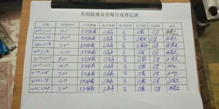 今天是疫情下復工的第四天,一大早,車間施主任就提醒員工們寫好每日兩點行程軌跡,要求員工工作期間不聚眾聊天,不隨意外出,回家后不隨意到人多的地方,盡量居家。每日行程表的填寫,是對自己每日遵守復工防疫規則的回顧,也是提醒自己后面疫情不散,防控不減。車間主任每日上下午不定時巡查,做好防疫安全巡查記錄,在保障齒條齒輪生產有序安排的基礎上,產品質量管理不放松,防疫安全不放松。云翔機械齒條齒輪生產的有序復工,來自管理層的嚴格與仔細。