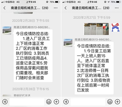云翔機(jī)械復(fù)工復(fù)產(chǎn)后,每日的防疫安全定點(diǎn)到人,不容遺漏。從早晨進(jìn)公司消毒各種場(chǎng)所,測(cè)量體溫,發(fā)放防疫用品,一日兩次巡查員工防疫安全措施的實(shí)施,每項(xiàng)工作記錄在冊(cè)。每日工作結(jié)束后,由防疫組組長(zhǎng)胡慶菲抽樣檢查各種記錄,并做好每日防疫安全工作簡(jiǎn)短總結(jié),在員工群公示。復(fù)工后,云翔機(jī)械齒條齒輪訂單量足,全體員工遵循兩點(diǎn)間活動(dòng)的生活工作軌跡,防疫復(fù)工兩手抓,企業(yè)復(fù)工運(yùn)行有序。